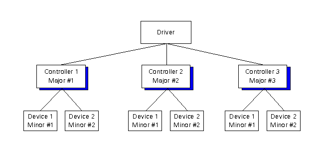 The major and minor device numbers are related to one another as illustrated in ``Major and minor numbers''. A given software driver can be working with one or more hardware controllers, each of which has its own major number. Each device connected to a given controller then would have its own minor number. Thus, any single device can be identified through the major/minor number combination.