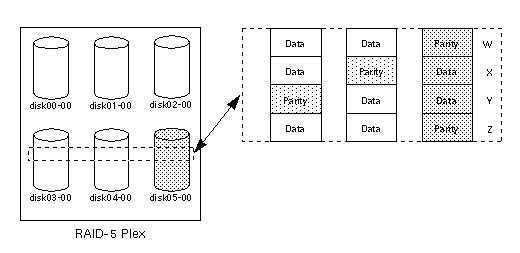 This would stack subdisks disk00-00 and disk03-00 consecutively in column 0, subdisks disk01-00 and disk04-00 consecutively in column 1, and subdisks disk02-00 and disk05-00 in column 2. Offsets can also be specified to create sparse RAID-5 plexes, as for striped plexes.